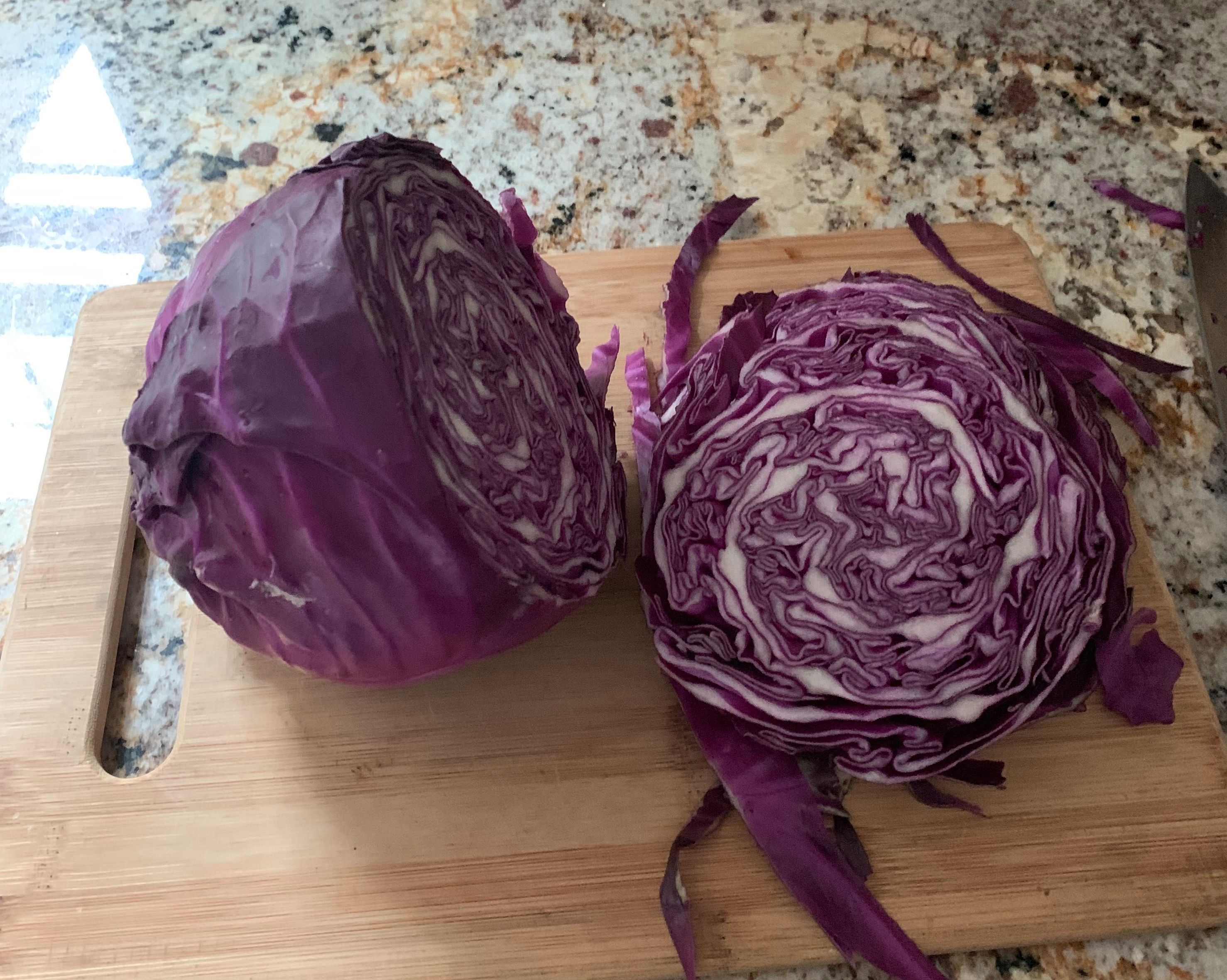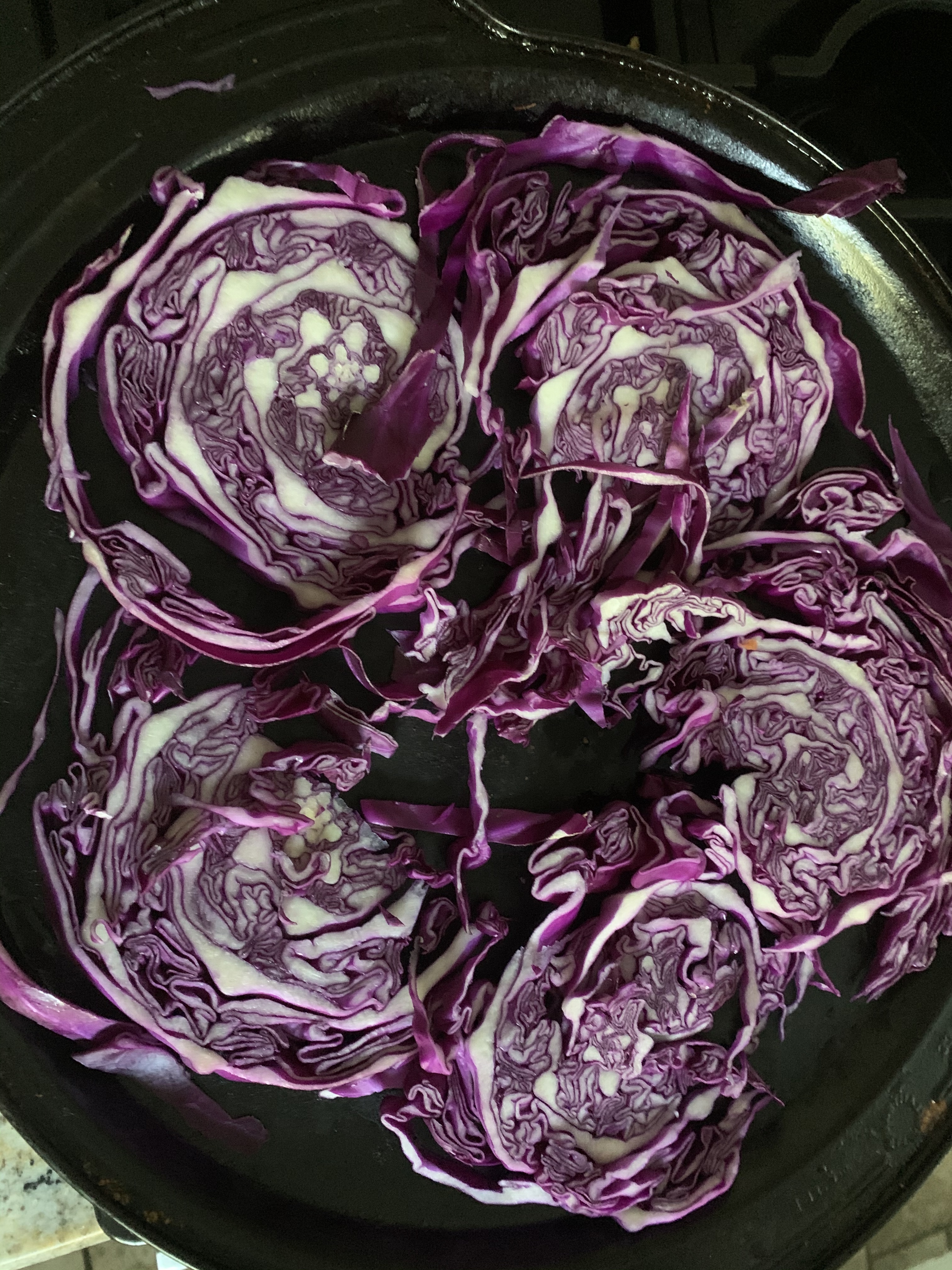 Really simple recipe today and I hope I sound convincing because it is LIFE CHANGING!!!! Roasted Cabbage. So simple but SO good. I never ate much cabbage before I started making this…unless it was from coleslaw or sauerkraut when I was young and my dad would force me to eat it (which I now love). Growing up we consumed a shockingly small amount of vegetables. Like, I’m fairly certain I didn’t even see a vegetable between the years 1986-1999. Unless it was french fries, ha! I’m sort of joking of course but really, I was not a fan and they weren’t pushed on me. Actually, I would not say I became a fan of vegetables until my mid 20’s and I finally learned to respect and love sweet potatoes like the gift from God that they are! Than I started branching out more and more. Brussel sprouts… I love love love love love brussel sprouts. Parsnips, broccoli, spinach, asparagus. YUM. Give me all the vegetables basically. Well, you can keep lima beans. Anyway, I saw someone eating or talking about eating roasted cabbage once online and I thought to myself hmmmm, that sounds interesting. Cabbage never made it to my grocery list before that and I would only have it on the rare occasion outside the house. Once, in my pre-vegetable loving days my husband asked for a head of iceberg lettuce but I bought him a head of cabbage instead, he was so grossed out and loves telling that story almost 20 years later while I roll my eyes dramatically. Anyway, roasted cabbage. I almost always buy red cabbage because it is just sooo beautiful! But green works just as well. Sometimes I roast it and than chop it up to use in a taco bowl or something like that but mostly we eat it just as it is. Ok, on the the recipe! I hope you all love it as much as I do!