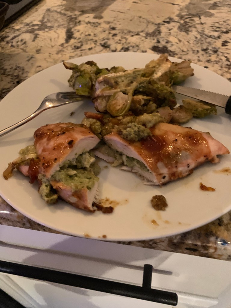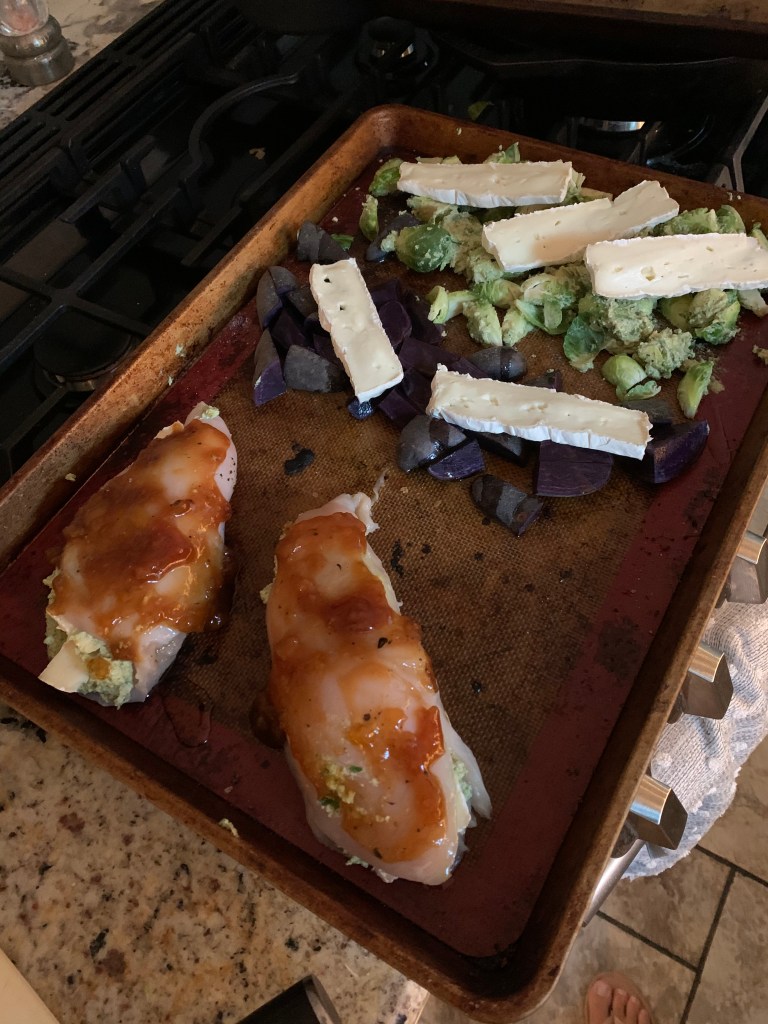 Wow, it has been a REALLY long time since my last post! Yikes! When I finally started sharing this space with my few close friends (and for the entire internet to see) I committed to posting at least once a week, if not more. I went a few days over here and there but mostly stayed pretty on top of my commitment. I have tried to keep my posts light and fun and of course educational π but the current state of…everything(!) has been making me feel a little darker and heavier than I would like and did not leave me in a good place to write. I’ve mentioned before I hate living in fear but… things have been feeling bleak lately! I’m really trying to turn that feeling around. Practicing mindfulness, spreading kindness. Something that keeps popping in my head is PERSONAL ACCOUNTABILITY! Being responsible for our own actions and the repercussions of those actions and just overall striving to be a good, kind, loving person… that washes her hands a lot and wears a mask when around other people. Fun times friends, FUN times. That said I HAVE been cooking/baking quite a bit so I will be catching up on the lost time :). First up!! The ever so amazing… Stuffed chicken II!! I hadn’t made this in months because I was sticking to simpler recipes while we were on lock down. So making it again after several weeks was such a treat and I wish I had doubled the recipe because I wanted it again the next day :). I’m sure I have gone on about how much I love brie in the past and this recipe HAS it! Plus a crazy good goat cheese based pesto that is kind of like a green goddess spread. I usually make this as a one pan dinner with two of our favorite vegetables… purple potatoes for my husband and brussel sprouts for me. Of course you could sub these out with whatever your fave veggie is and most likely the cooking time will remain the same. But if not, use a different pan! Ok recipe below!