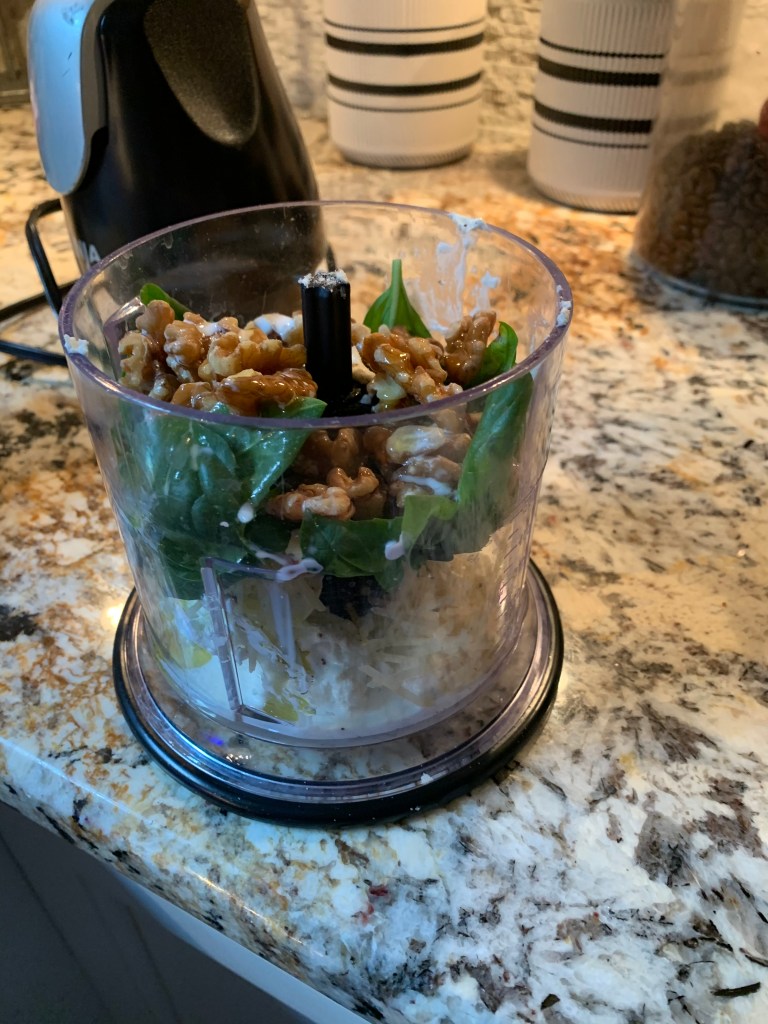 Start by making the pesto. In a food processor combine the goat cheese, basil, walnuts, s&p, olive oil, splash half & half and shredded parmesan. As long as your goat cheese is room temp it should all mix up pretty quickly. Set this aside. On a cutting board take your two chicken breasts and butterfly them. I like my breasts REALLY thin so I actually butterfly it twice, taking the bottom layer totally off and using it for something else and than butterflying again and leaving in tact this time. Push the breasts down onto a baking sheet and smother both sides with the pesto. I don’t use all of it on the breasts but most of it, I save some to mix into my vegetables. Ok, now cut your brie into strips maybe like 1/4 of an inch thick. Push on top of the pesto on the chicken and than close the chicken up. Now mix the balsamic vinegar and preserves in a small bowl and spread over the chicken. Make sure the chicken is on the far side of the pan. Now dice up your potatoes and brussel sprouts or whatever you are using and put on the remainder of baking sheet. Top with olive oil and sea salt and if you have any of the pesto left mix it all in. If I have brie left I put it on top of the veggies too. Bake at 400 for 30 minutes. YUM!!