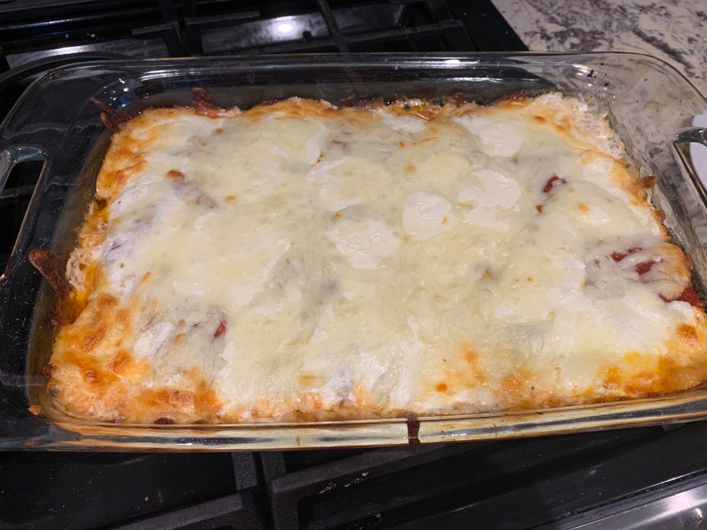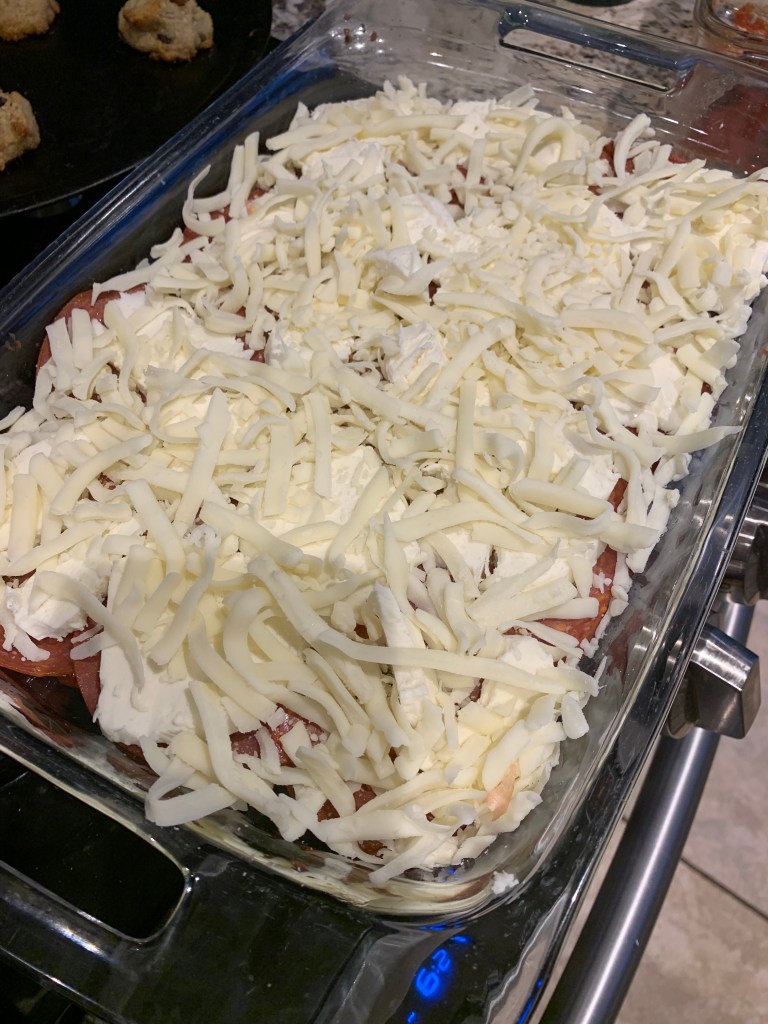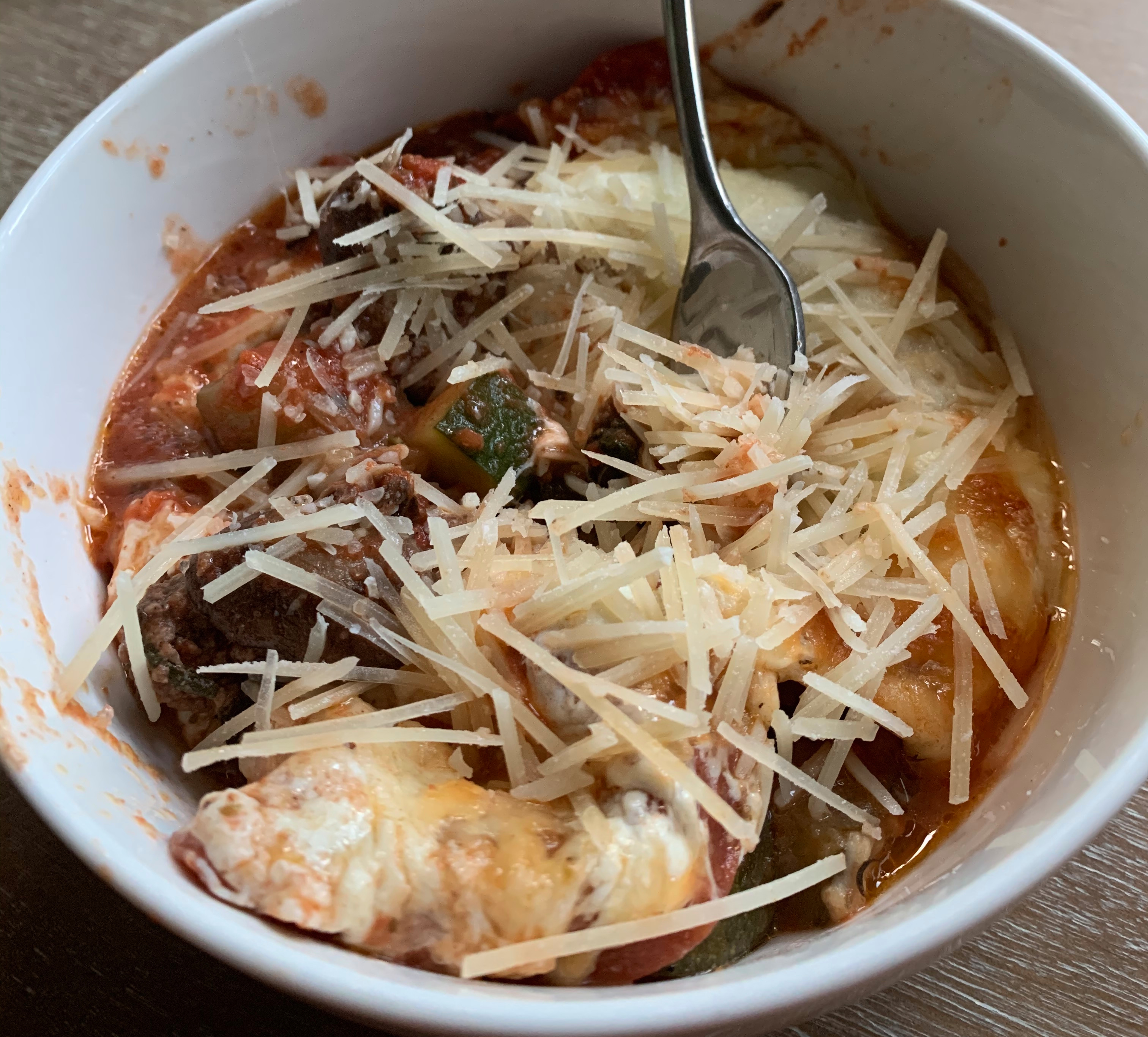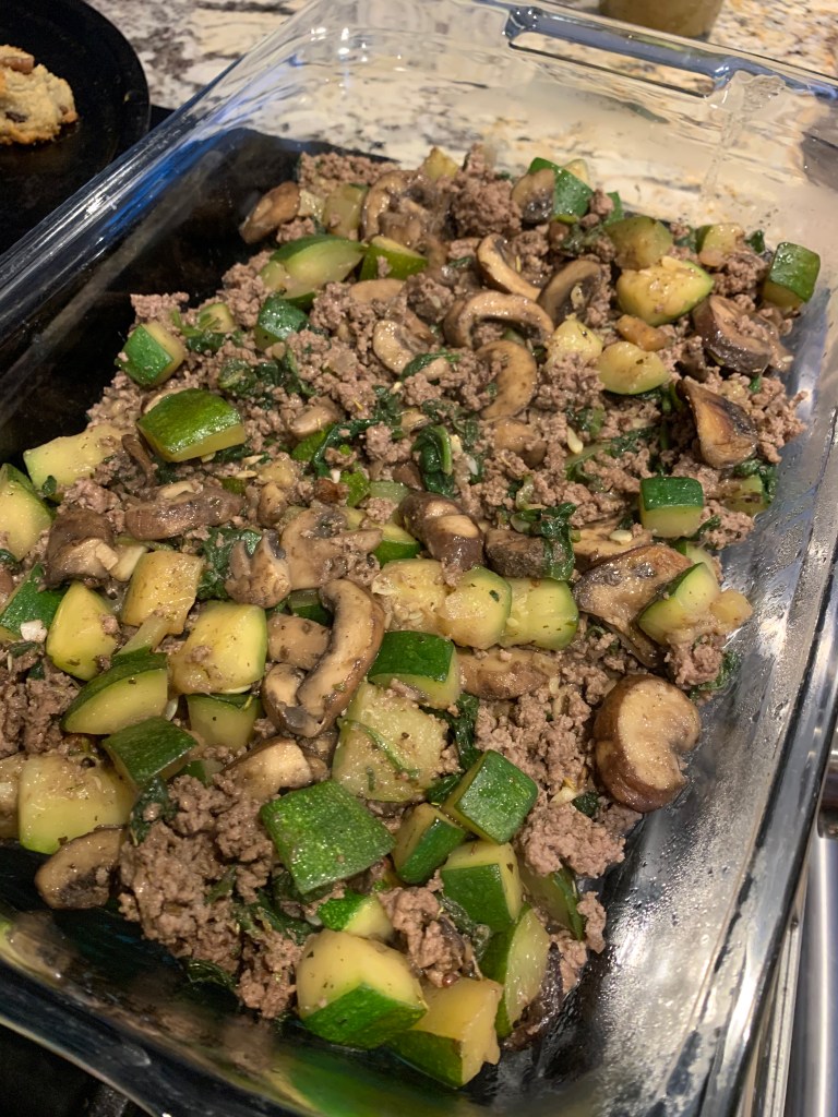 Saute diced zucchini and mushrooms in sea salt and olive oil until tender than add in fresh spinach until it starts to wilt, set aside. Add some diced onion and chopped garlic to a skillet with a bit of olive oil and cook over medium heat until tender and brown. Add in ground beef. Cook until well browned and drain off any fat, than season well with Italian seasoning and a few dashes of white wine vinegar. Mix well and add in zucchini mix. Spread this mixture into a bottom of a casserole dish. Top with a good layer of pizza sauce (find my recipe here) and than a layer of pepperoni. Top with a mixture of fresh mozzarella and shredded mozzarella. Bake at 375 for 30 minutes and serve up with sea salt and some fresh Parmesan.
