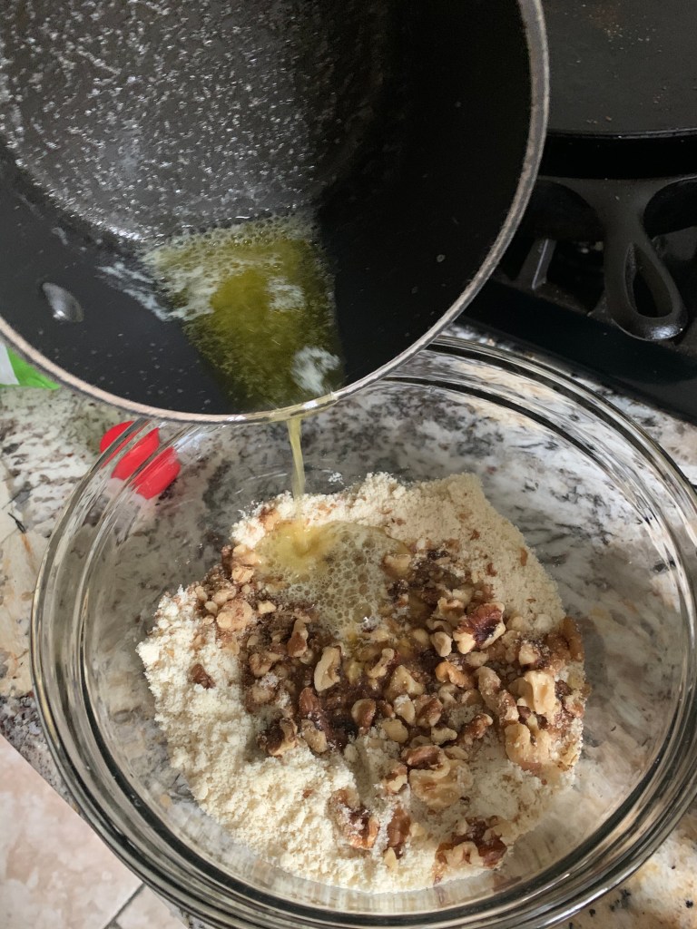 In a medium sized mixing bowl add flour, vanilla, sea salt, maple syrup and any add-ins you might be using, I used 1/2 cup chopped walnuts for this batch. In a small sauce pan melt the butter over medium high heat stirring frequently until it is light brown and fragrant like hazelnuts and heaven. You can just melt the butter and not brown it but I have to say it takes the balls up about 100 notches if you use the browned butter. Once the butter is ready add to the mixing bowl and mix well. Roll into several gumball sized sized balls using your hands. Arrange on a plate and put in freezer until cold. Than transfer to a storage container and keep in fridge. Makes about 16 balls.
