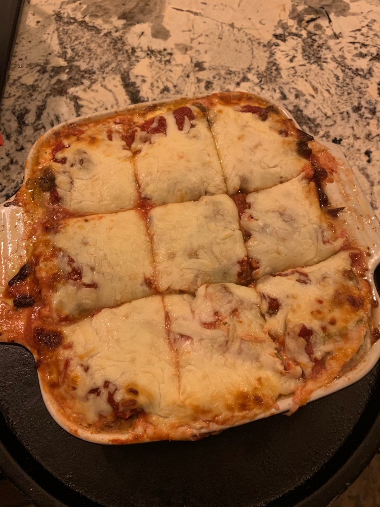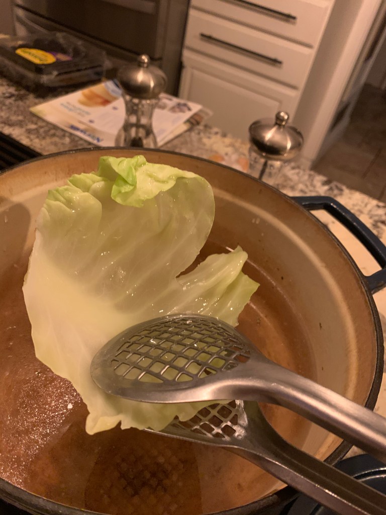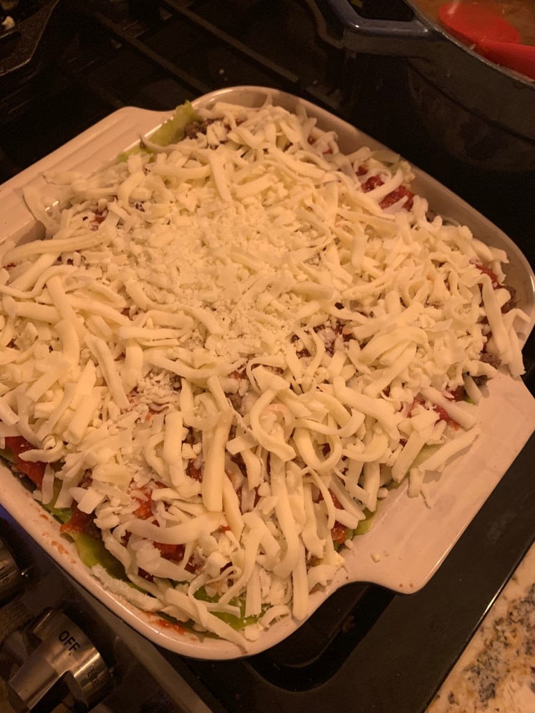 Begin by boiling some water in a large pot. Try to remove 10 or so full layers from the cabbage and boil for 8 mintues (I only boil three leaves at a time so this will take a few batches) until translucent and tender. If it is too hard to get the layers peeled away nicely you can also cut it into quarters and boil a batch at a time. Drain and set aside on a plate lined with paper towels so they can cool and dry a bit. Next cook up ground beef and drain any fat if needed. In a large mixing bowl mix ricotta, 1 cup of mozzarella, eggs, oregano, grated parmesan and set aside. Now arrange a layer of cabbage into a baking dish. I use a 9×9 for this. Spoon/spread 1/3 the cheese mixture over the cabbage leaves than 1/3 of the meat mixture followed by a layer of sauce and sprinkle with mozzarella cheese. Top this with another layer of cabbage and repeat the next steps. Topping it all off with one more layer of cabbage, the rest of the cheese mix, meat mix, sauce and cheese. Before I bake this I place the baking dish on top of a larger baking sheet to capture any liquid that might run into your oven! Bake for 35-40 minutes at 375. If cheese isn’t brown enough throw the broiler on for a few minutes at the end.