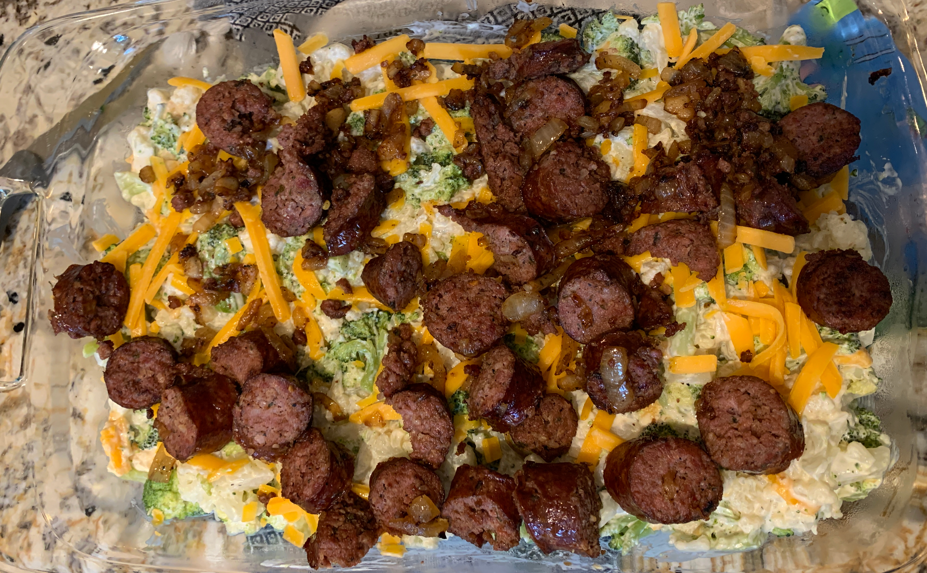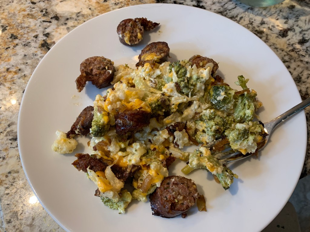 Preheat oven to 400. Boil about 4-6 cups of water in a large pot. Once rapidly boiling add in broccoli and cauliflower and boil for 3 minutes. Next heat up oil in skillet and brown shallot and garlic. Stir in sausage and brown all over until cooked all the way through, stirring frequently on medium/high heat. In a mixing bowl combine mayo, cream cheese, 1 cup cheddar, dijon, horseradish, salt and pepper. Stir this mixture into the broccoli and cauliflower. Than spread evenly into casserole dish. Top with cooked sausage and remaining cheese. Bake 12-15 minutes and enjoy!
