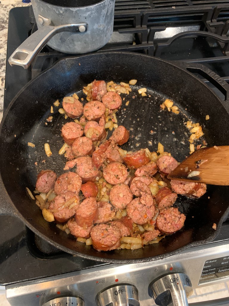 - 12 ounces andouille, smoked or polish sausage cut into 1 inch rounds