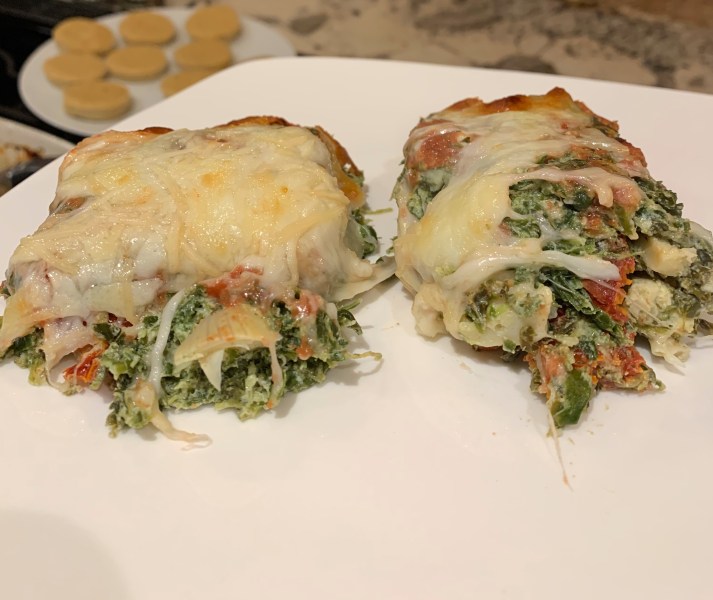 Directions: Thaw and drain two packages of frozen spinach and add in two eggs than mix well. In a large skillet heat up olive oil and add in chopped shallot and garlic. Saute on low/medium for 5 minutes or so until browned and fragrant. Add to the spinach. Next add in softened cream cheese, Greek yogurt, sun dried tomatoes, artichoke hearts, chicken and Parmesan. Mix well. Spread down into a casserole dish. Cover with thin layer of red sauce and than top with mozzarella. It actually tastes kind of like lasagna strangely. Enjoy!!